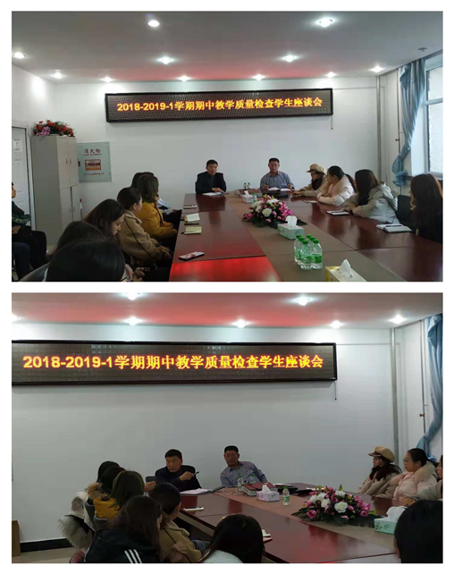 2018年11月28日15:30在第五教学楼402会议室召开2018-2019-1学期期中教学质量检查员工座谈会,公司书记孔若东老师、督导吴俊江老师主持会议,各班级员工代表参加。