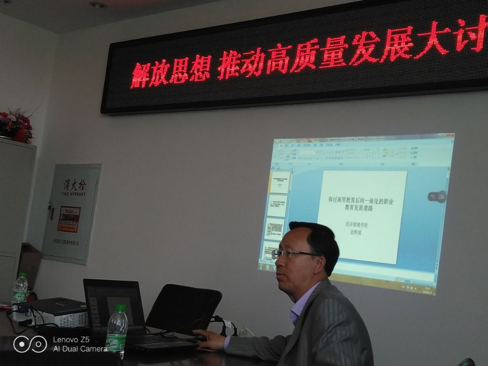 郝毓业老师作了题为《论青年教师课程定向与学术方向的三重门》的发言,郝老师提出困扰青年教师职业发展道路的“三重门”,即课程方向确定不了方向,学术研究研究不出中心,课程与学术相互脱节,进而提出“四密钥”,即长者导之,青者习之;生活学术化,学术生活化;一处敲之,静听回响;课程为王,工作过程导向,并将赴北京参会学习到的关于《客房运营管理》这门课程的收获与心得与教师分享。王剑副教授站在一线教师的角度,从思想认识、教学研究及高质量人才培养方面谈了自己的心得体会。他提出思想是大事,要对标一流,时不我待。对标一流,才能更好地找到差距,明确方向,并通过对标一流,找到自身在教学研究方面的不足,最后提出“教学需要的,可能不是革新,而是回归。能够坚守初心,不计名利的教育工作者才能真正为公司的高质量发展做出自己的贡献”。金熙成教授最后作了题为《探讨高等教育后向一体化的职业教育发展道路》的发言。金教授从宏观的角度分析我国高等教育体制的缺陷,并提出建立与985、211院校全面对接的大学职业教育体系,即高等院校职业教育后向一体化战略,最后提出公司应加强“双师双能型”教师的建设,即“教师+工程师”、“智能+技能型”教师队伍,准备建设成为与985和211对接的职业教育大学。