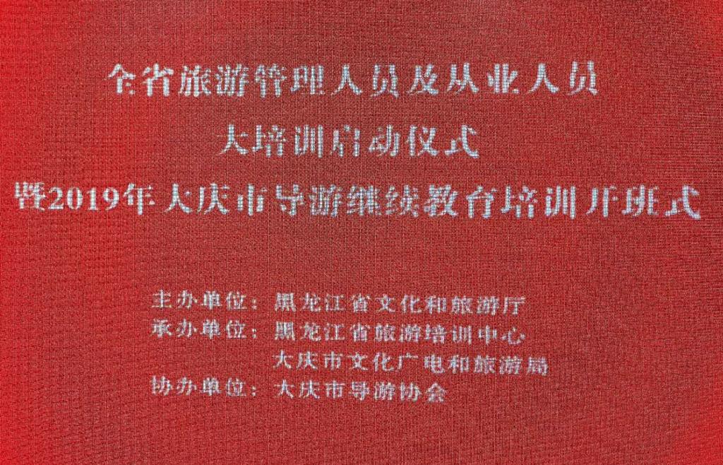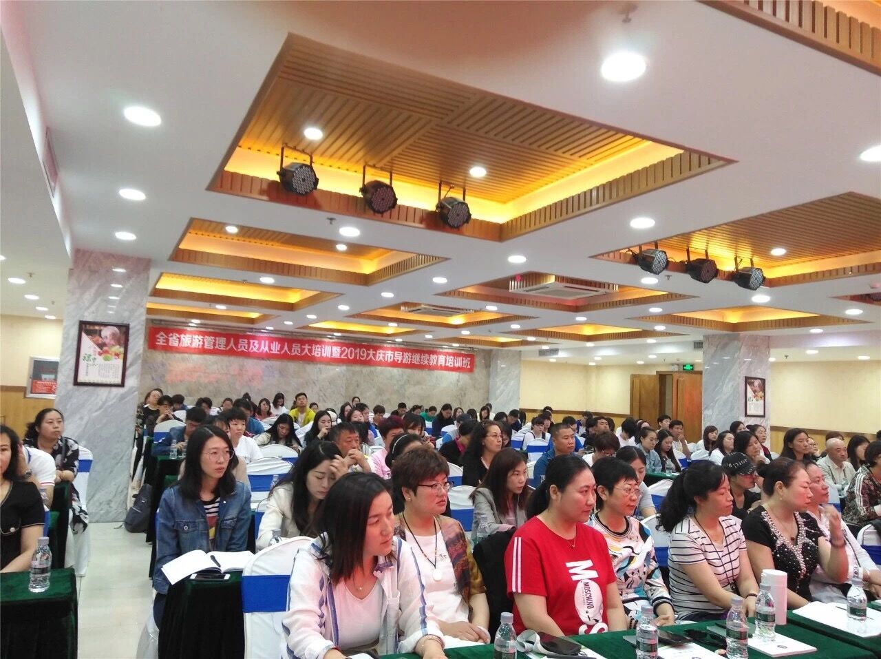 2019年6月3日,由黑龙江省文化和旅游厅主办,黑龙江省旅游培训中心、大庆市文化广电和旅游局承办,大庆市导游协会协办的全省旅游管理人员及从业人员暨2019年大庆市导游继续教育培训班在大庆市九龙潭商务酒店多功能厅正式开班,参加开班仪式的有黑龙省文化和旅游厅调研员赵佩先,大庆市文化广电和旅游局副局长柴威,黑龙江省旅游培训中心主任郝思印及全市200多名专兼职导游员、景区讲解员。培训班为期三天,采取专家授课和召开座谈会等形式进行,培训内容主要有《导游管理办法》解读和导游安全事故预防、导游讲解技能提升和导游带团技巧、文明旅游与导游文明服务等,这次培训有利于加强导游队伍建设,提高导游服务质量。