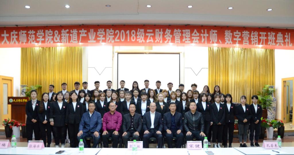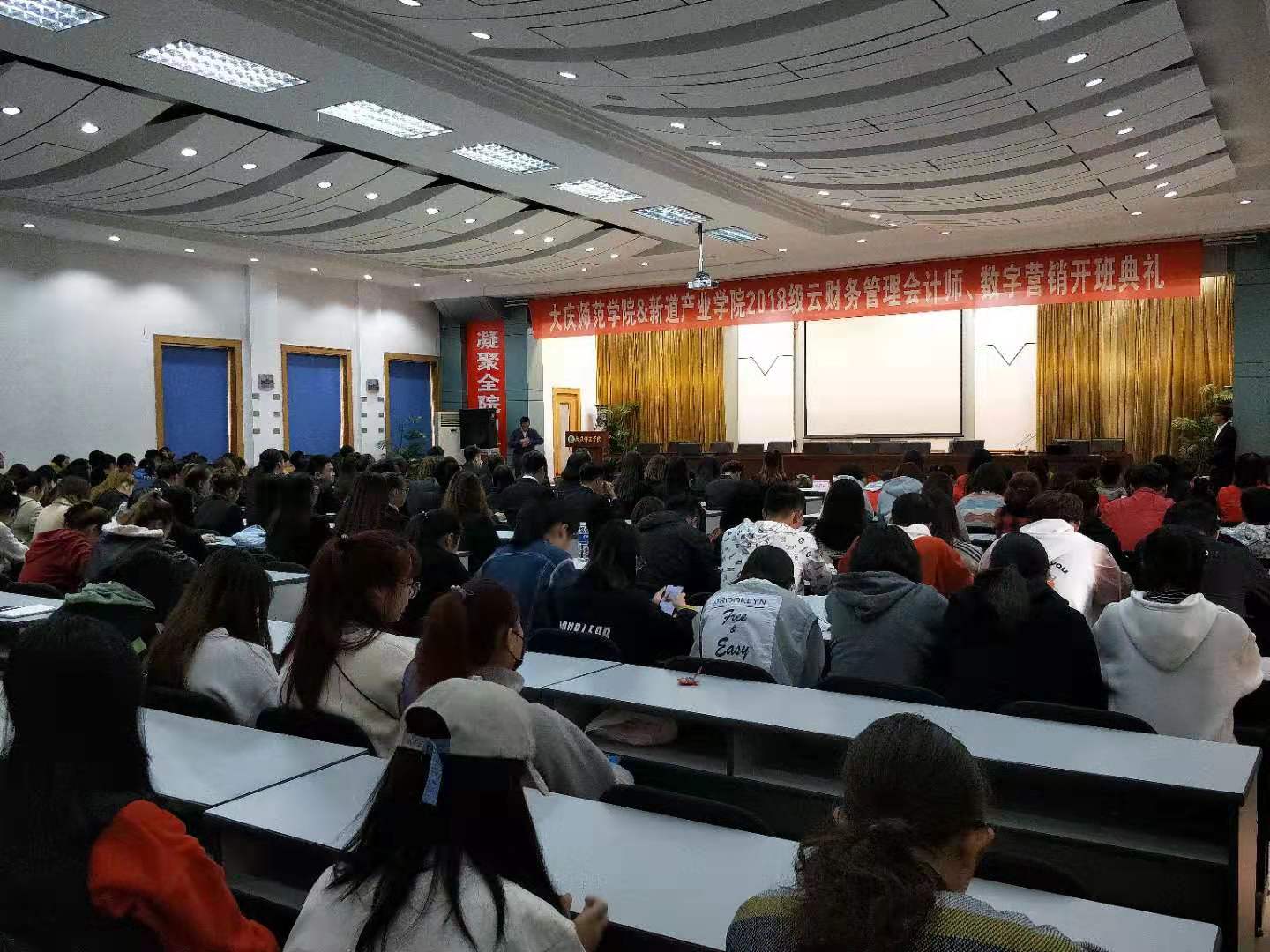 产教融合培养应用型经管类人才,公司与新道科技有限公司合作,于2019年10月23日下午15点30分在qmh球盟会铁人讲堂举行2018级云财务管理会计师、数字营销开班典礼。新道科技有限公司高级副总裁宋健先生、黑龙江省总经理张海冰先生、黑龙江省区域经理王学松先生,qmh球盟会副董事长郭崇林教授、球盟会孔若东书记、刘楠经理、部分教师代表、辅导员、2018级财务管理专业和市场营销专业全体员工,2019级员工代表参加了此次开班典礼,典礼由刘楠经理主持。